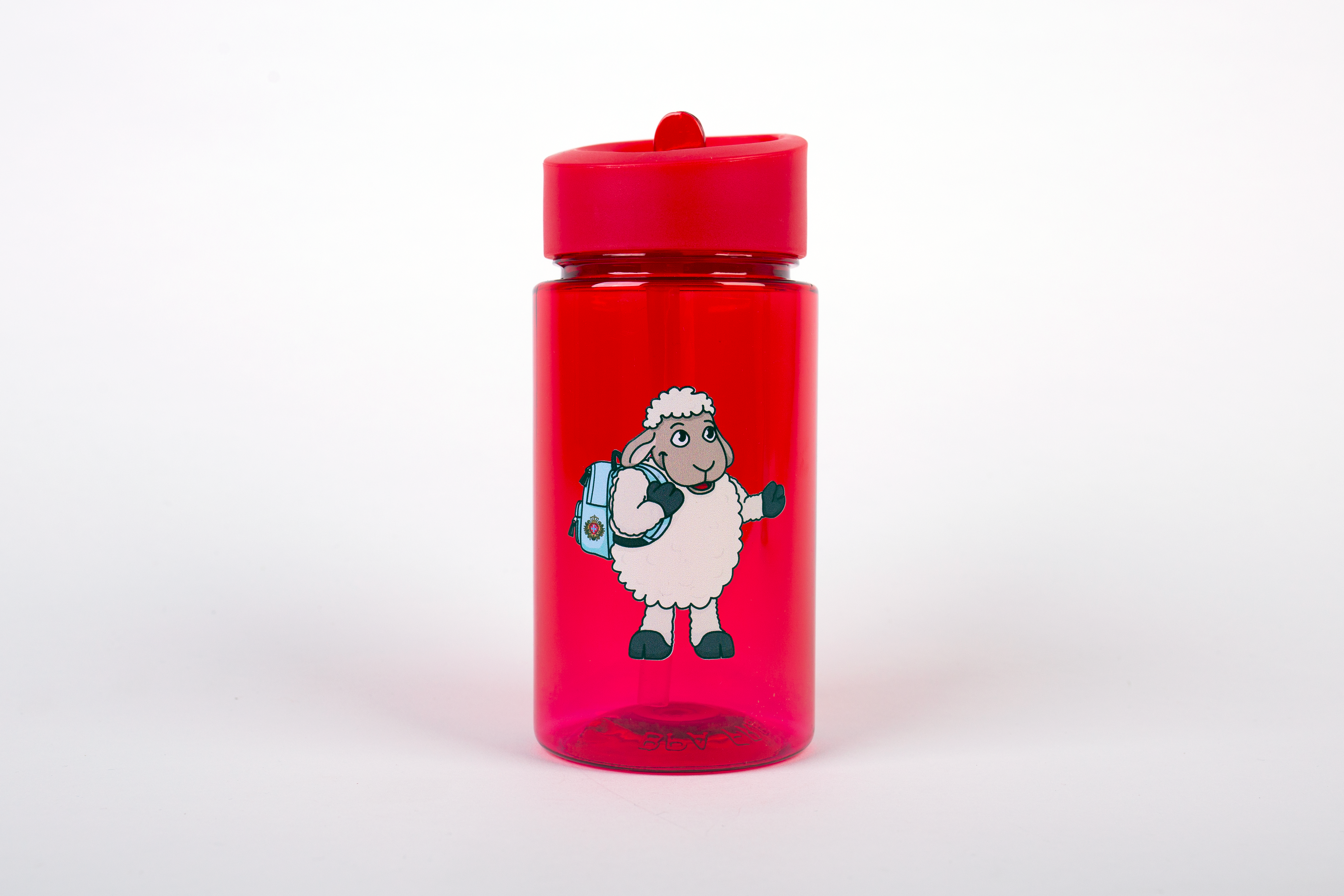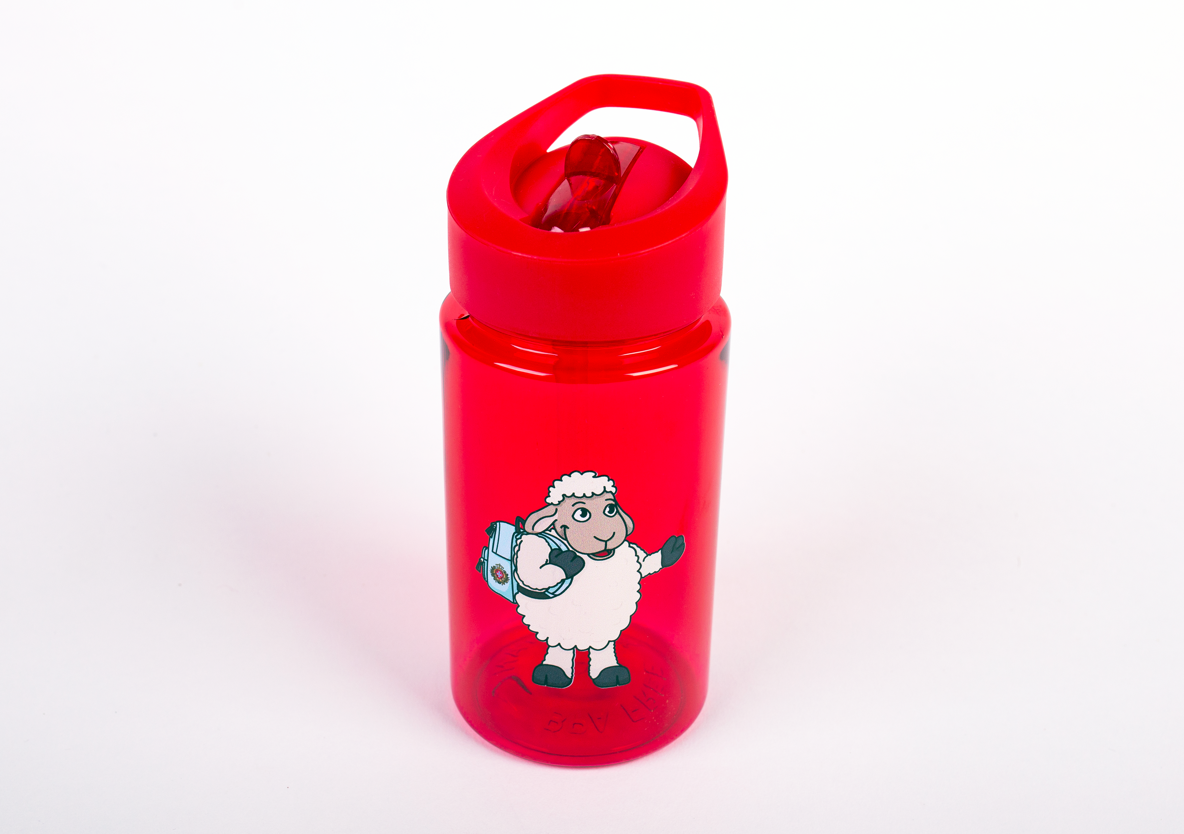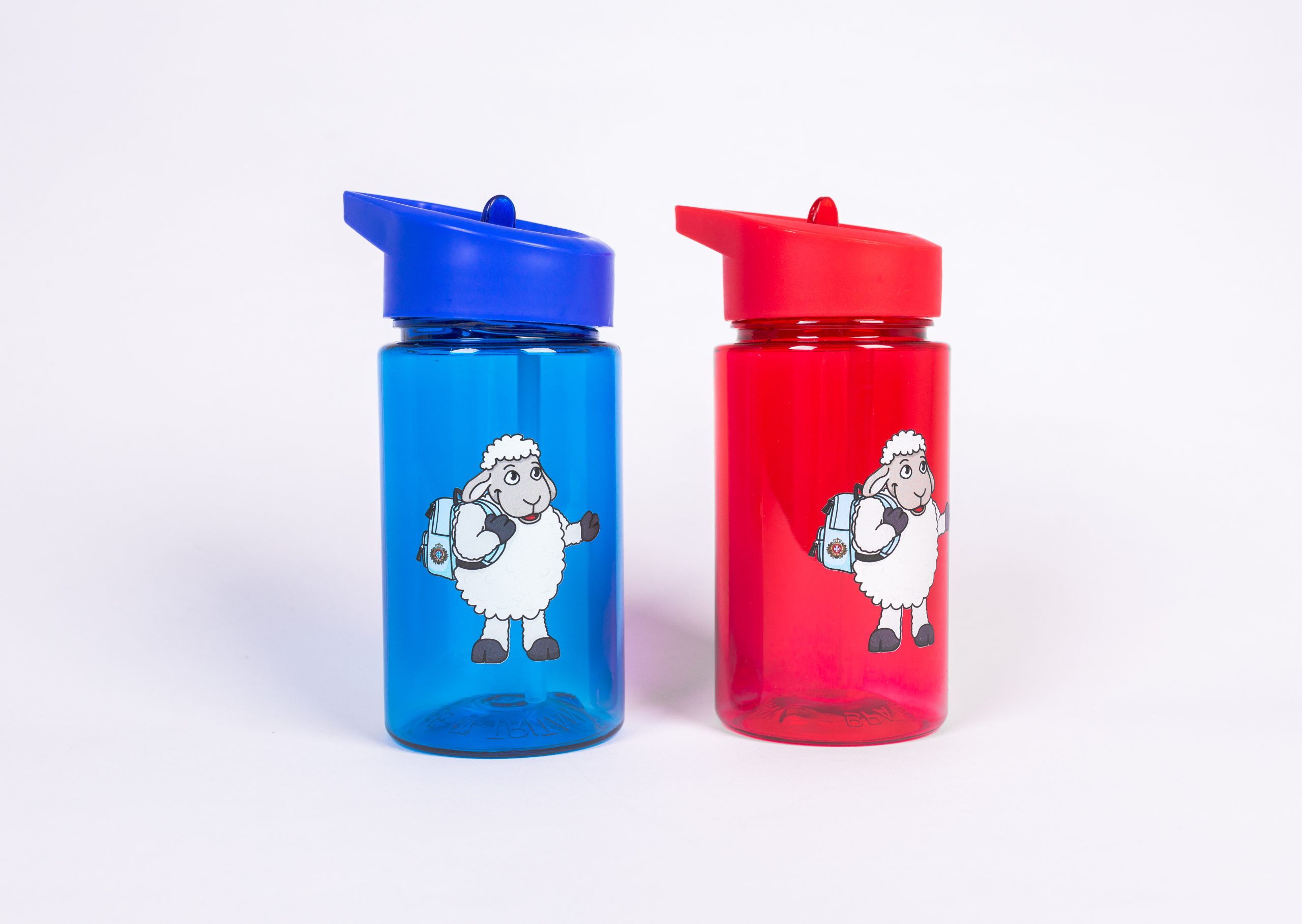 Garrafa de água em plástico com ilustração da nossa mascote, a ovelhinha “Misi”. Disponível em azul ou vermelho.