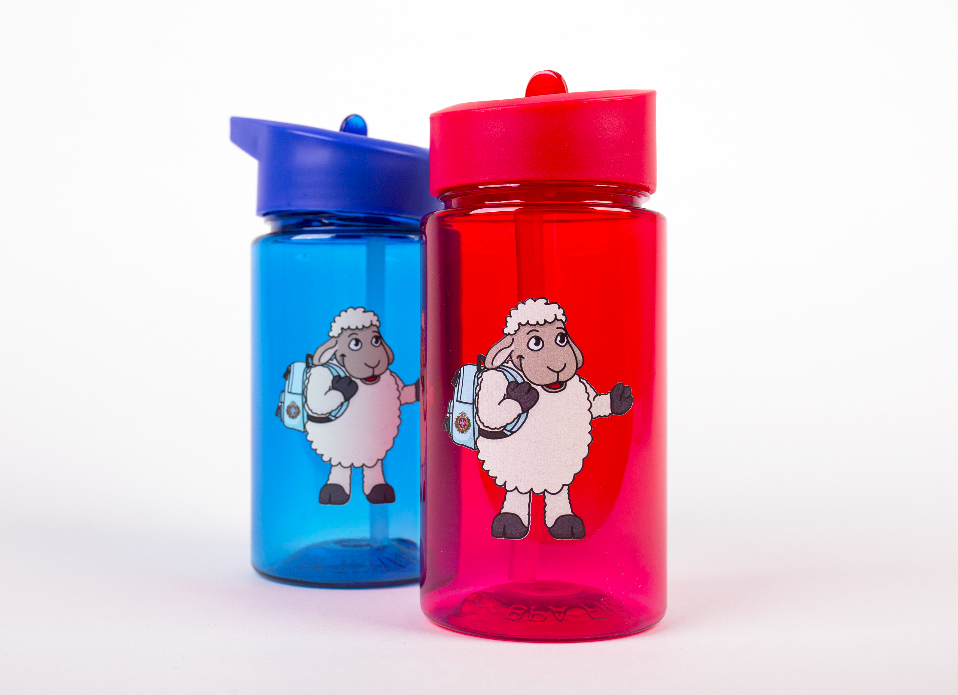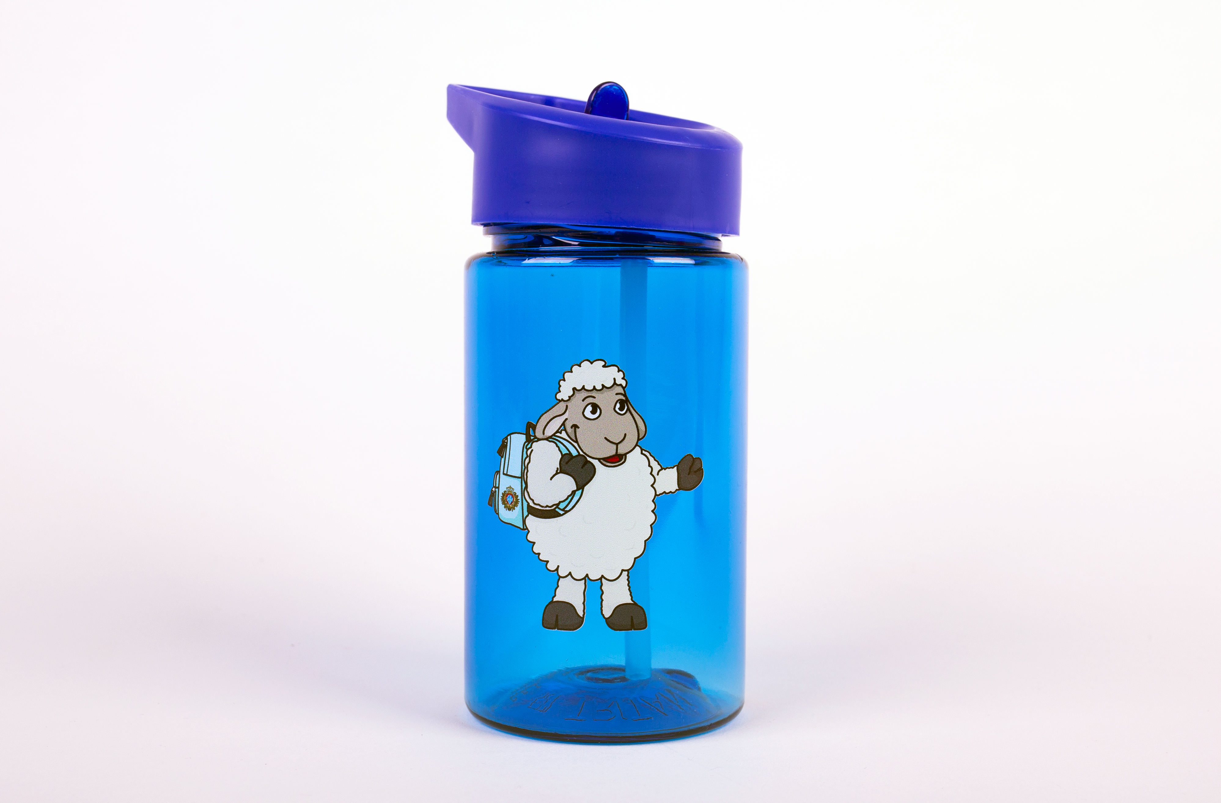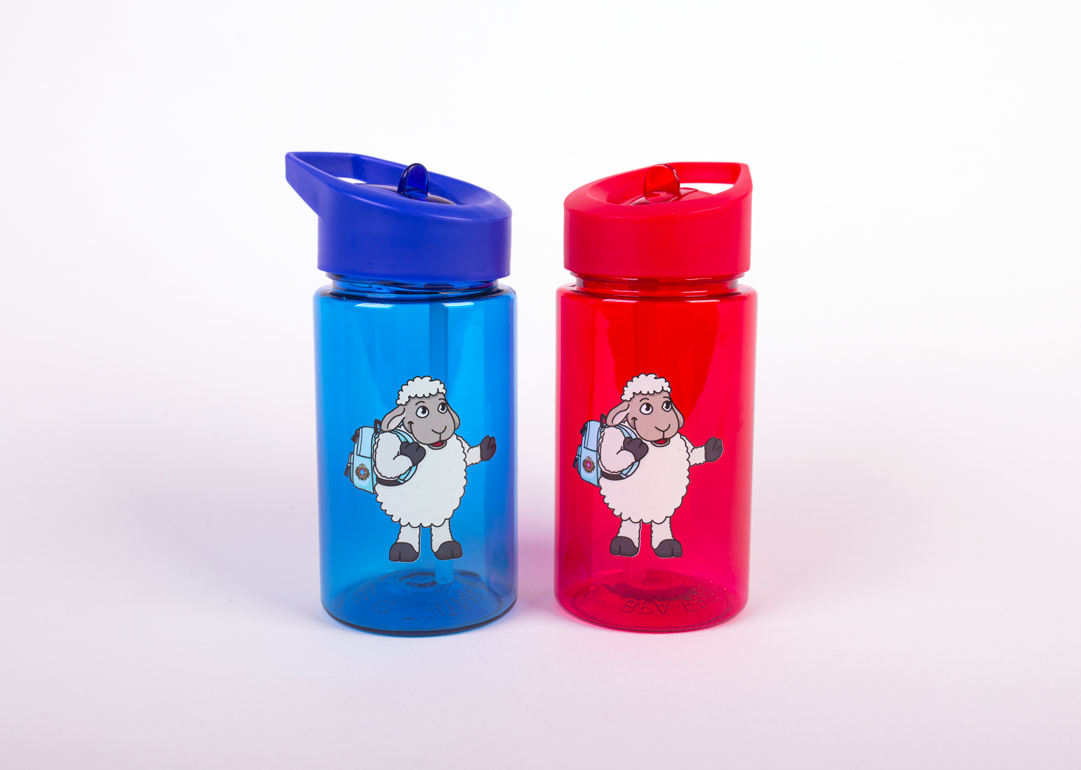 Garrafa de água em plástico com ilustração da nossa mascote, a ovelhinha “Misi”. Disponível em azul ou vermelho.